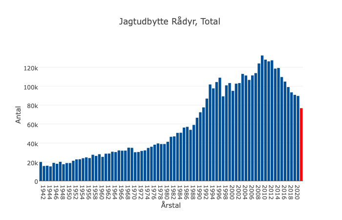 Med til billedet hører informationen, at i den undersøgte jagtsæson blev der i Danmark nedlagt 103.000 stykker råvildt, mens udbyttet i 2010-2011 nåede op på 128.200, som dog var et fald i forhold til i 2009-2010, hvor det danske råvildtudbytte nåede helt op på 133.600.