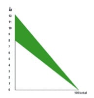 Derimod kan afskydningen differentieres, så man giver kortere jagttid på B – hjortene og længere jagttid på A -hjortene. Derved sikrer vi, at tilvæksten af voksne hjorte (Fig. 7 grøn trekant) sker med de bedst anlagte unge og mellemaldrende hjorte, medens den nødvendige reduktion sker ved forøget afskydning af de yngste og de ringeste. På bilag 1 svarer det til at forskyde afskydningen fra højresidens stærke B -hjorte til overvejende at ligge på venstresidens ringe A -hjorte (grøn).