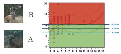 I artiklen: http://www.netnatur.dk/mellemhjortefredning-a-selektion/ gennemgik jeg, hvorfor ”Mellemhjortefredning” – forstået som sprossefredning ”fra neden”- er fuldstændig ødelæggende for hjortebestandens sammensætning op gennem de enkelte årgange. A – gruppen består af hjorte </= 10 ender og B – gruppen består af hjorte >/= 12 ender.