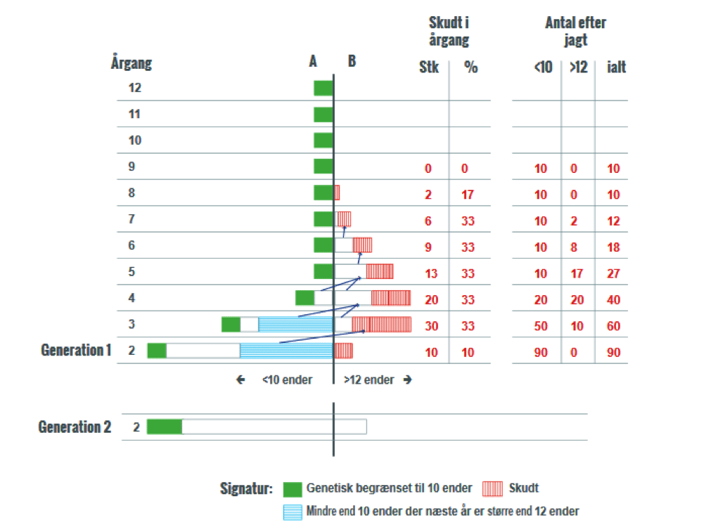 Jeg forklarer endvidere i artiklen, hvorledes det får den konsekvens, at de 2 -årige hjorte, der er genetisk begrænset til maksimalt 10 -ender, i næste generation udgør en større andel end i den foregående. Man har derved startet en accelererende nedadgående spiral, hvor: