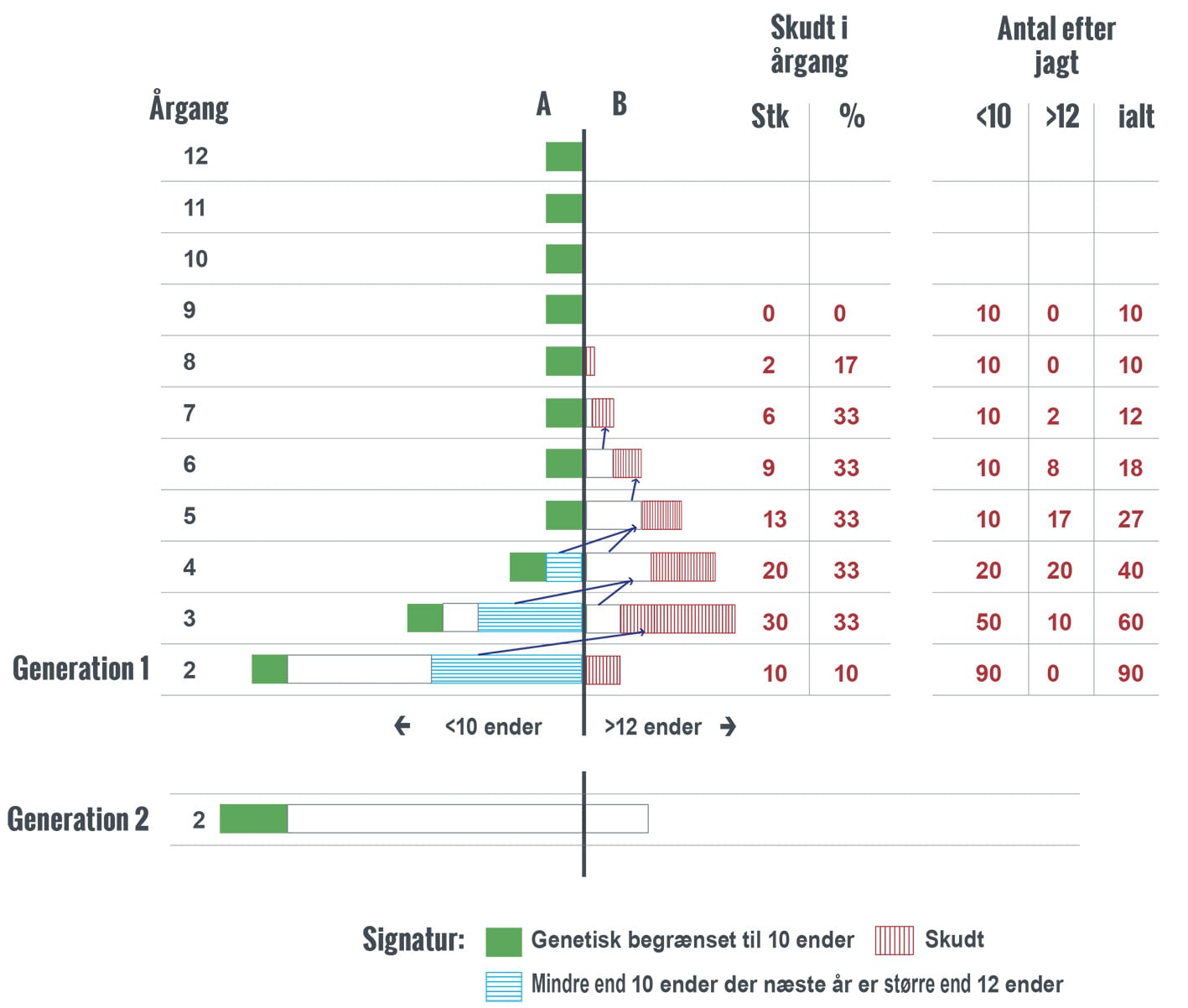 Bemærk: 100 % =100 hjorte i 2 – årsgruppen. A -gruppen er fredet. B – gruppen må skydes.