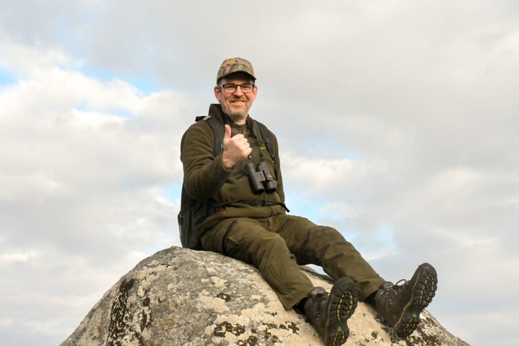 Efter nogen tids gang i terrænet, som det er hårdt at færdes i, finger Richard snart gederne, og da vi når frem bagved buske og træer, sidder de alle ned og tygger drøv, men rejser sig og står i nogen tid dækket bagved buskene, men da vi ser, at de bevæger sig mod højre, siger han, at nummer to fra højre er flokkens største gedebuk, og da de stopper, falder skuddet fra hans .CZ .243, der får bukken til at gå i ”brædderne”.
