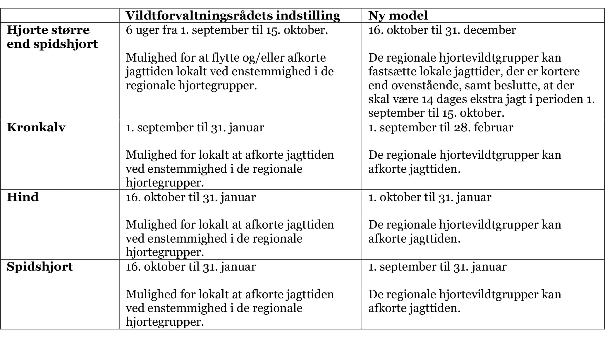 Forskellene mellem Vildtforvaltningsrådets forslag og min beslutning om de fremtidige jagttider fremgår af følgende skema: