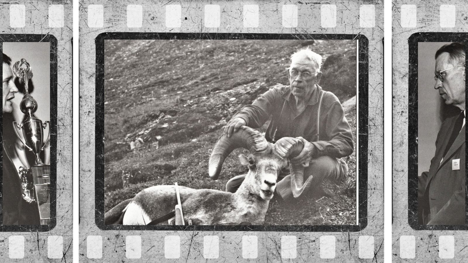 Jack O’Connor med en Stone Sheep-vædder, der er krydset med Dall Sheep og derfor har en meget lys dragt. (”The Weatherby”, 2004).