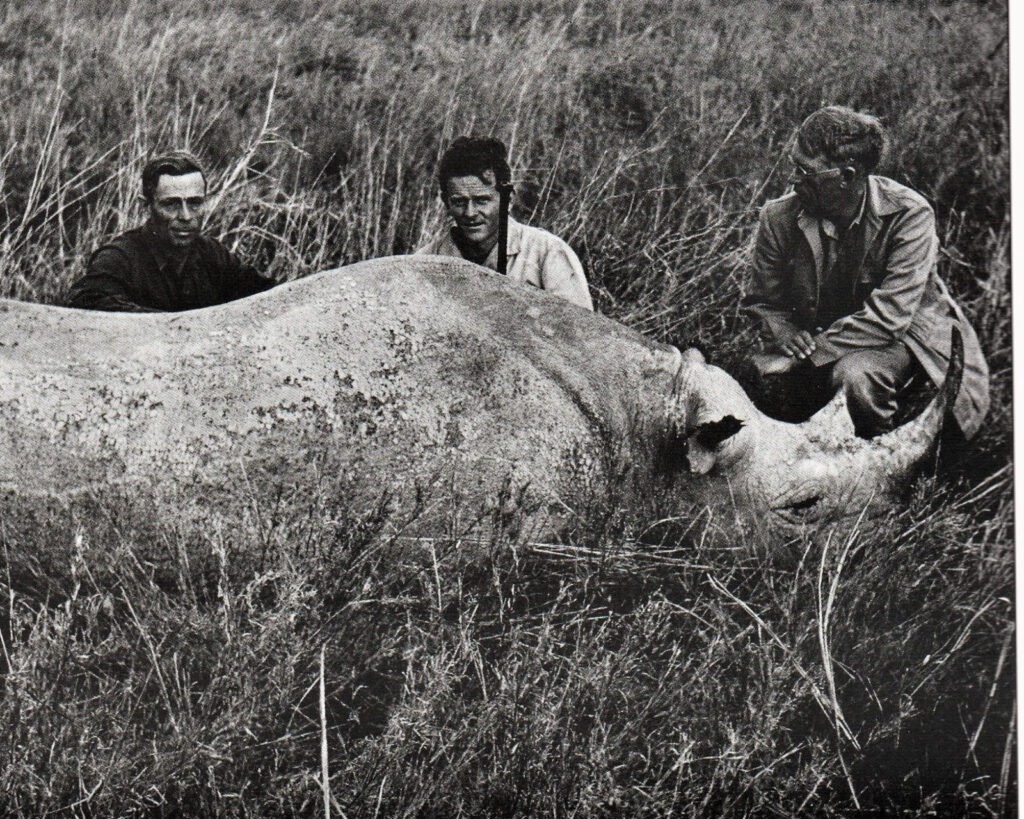 I Kenya skød Jack O’Connor blandt andet dette sorte næsehorn. Han blev guidet af den navnkundige Syd Downey, der i 1937 guidede Grev Ahlefeldt på hans første store safari, hvor han skød med bue. I midten Myler Turner. (”The Weatherby”, 2004).