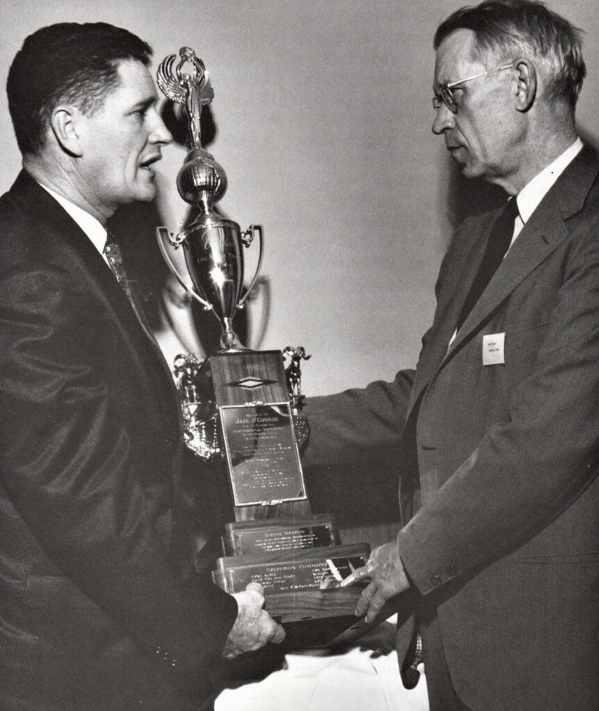 Joe Foss (til venstre) præsenterede The Weatherby Big Game Trophy for Jack O’Connor, da han i 1957 fik den fornemme udmærkelse. Joe Foss var tidligere guvernør i South Dakota. (”The Weatherby”, 2004).