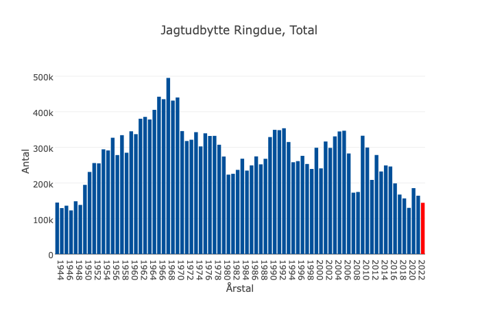 Der er jagttid på ringduen. I jagtsæsonen nedlægges der et svingende antal ringduer i Danmark.