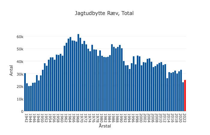 Antallet af nedlagte ræve jfr. vildtudnytte statistikken er historisk lav og man skal tilbage til årene omkring anden verdenskrig for at finde tilsvarende lave afskydningstal. KILDE DCE