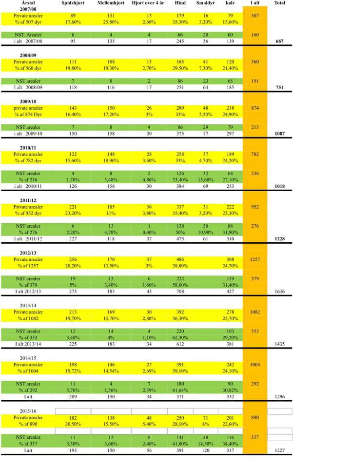 | ”Tendensen i afskydningen af hjorte, siden jagttiden blev ændret fra sæson 2011/12, ser desværre ikke ud til helt at opfylde målet om en større andel ældre hjorte i bestanden, vurderet ud fra afskydningen. Afskydningen af hjorte der er vurderet til at være 4½ år og ældre, er faldet i de tre sæsoner de nye jagttider har været gældende. Der bliver nedlagt en større andel(ANDEL/ANTAL – BID MÆRKE I DET) af unge hjorte der lever op til kravet om mindst ni sprosser i geviret – typisk hjorte på 3½ år.