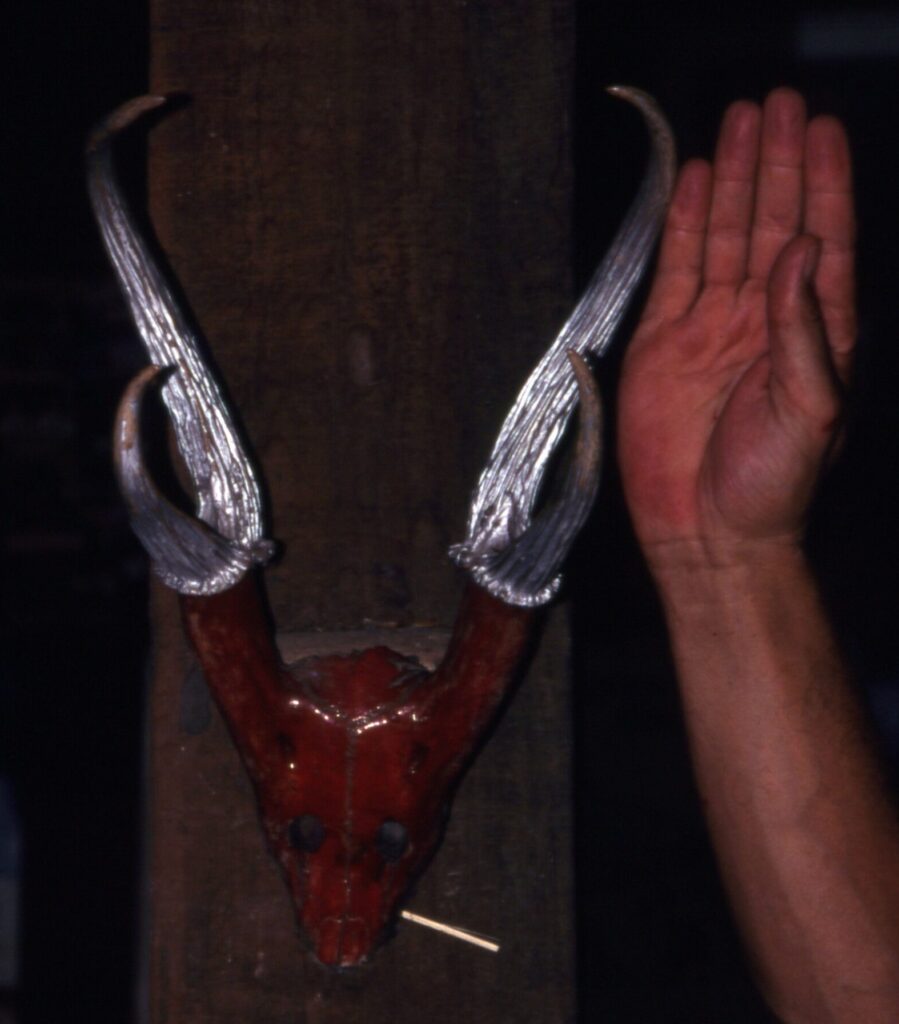 Den engelske videnskabsmand, John Mackinnon, som også havde fundet de første horn af Vu Quang oksen, faldt over adskillige gevirer, han ikke kunne genkende. De var alt for store til at stamme fra en “normal” muntjak hjort, (Muntiacus Muntjak) som der er ret mange af i området. Han fandt dem i jægernes hytter i Kim Quang landsbyen. Den samme landsby hvor han havde fundet de første horn fra Vu Quang oksen.