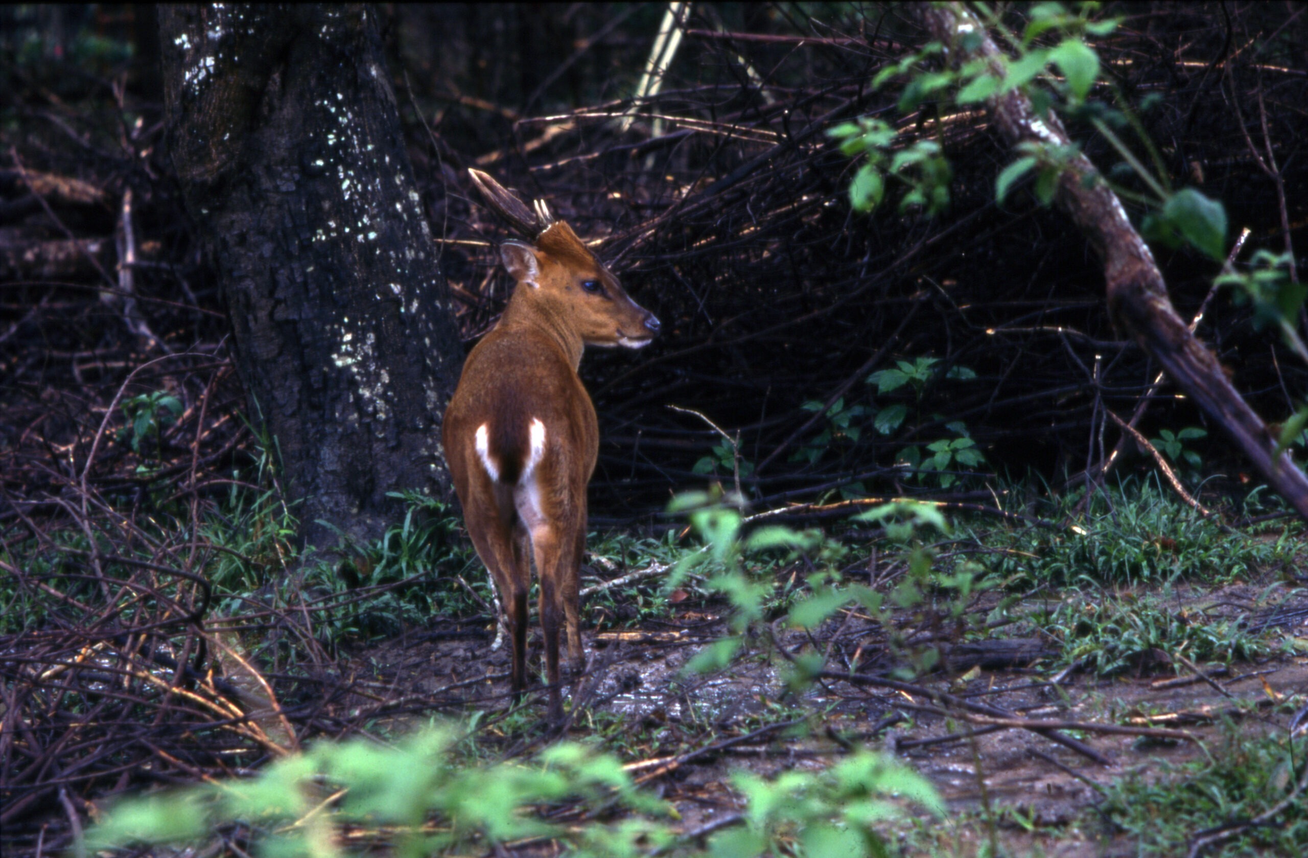 Jeg lytter til et par fugle højere oppe i “mit” træ, da den ophidsende lyd ude til højre igen får mine nerve-ender til at reagere. Jeg er nu 100% overbevist om at det er en hjort eller en vu quang okse. Efter professionelt at have jaget kronhjorte i New Zealand, lyttet til dem og observeret dem æde, skulle jeg ikke kunne tage fejl. Spørgsmålet er selvfølgelig bare om det er en Stor Muntjak. Det kan også en sambar (Cervus unicolor) eller den almindelige muntjak. Et vildsvin er det ikke, de laver meget mere støj.