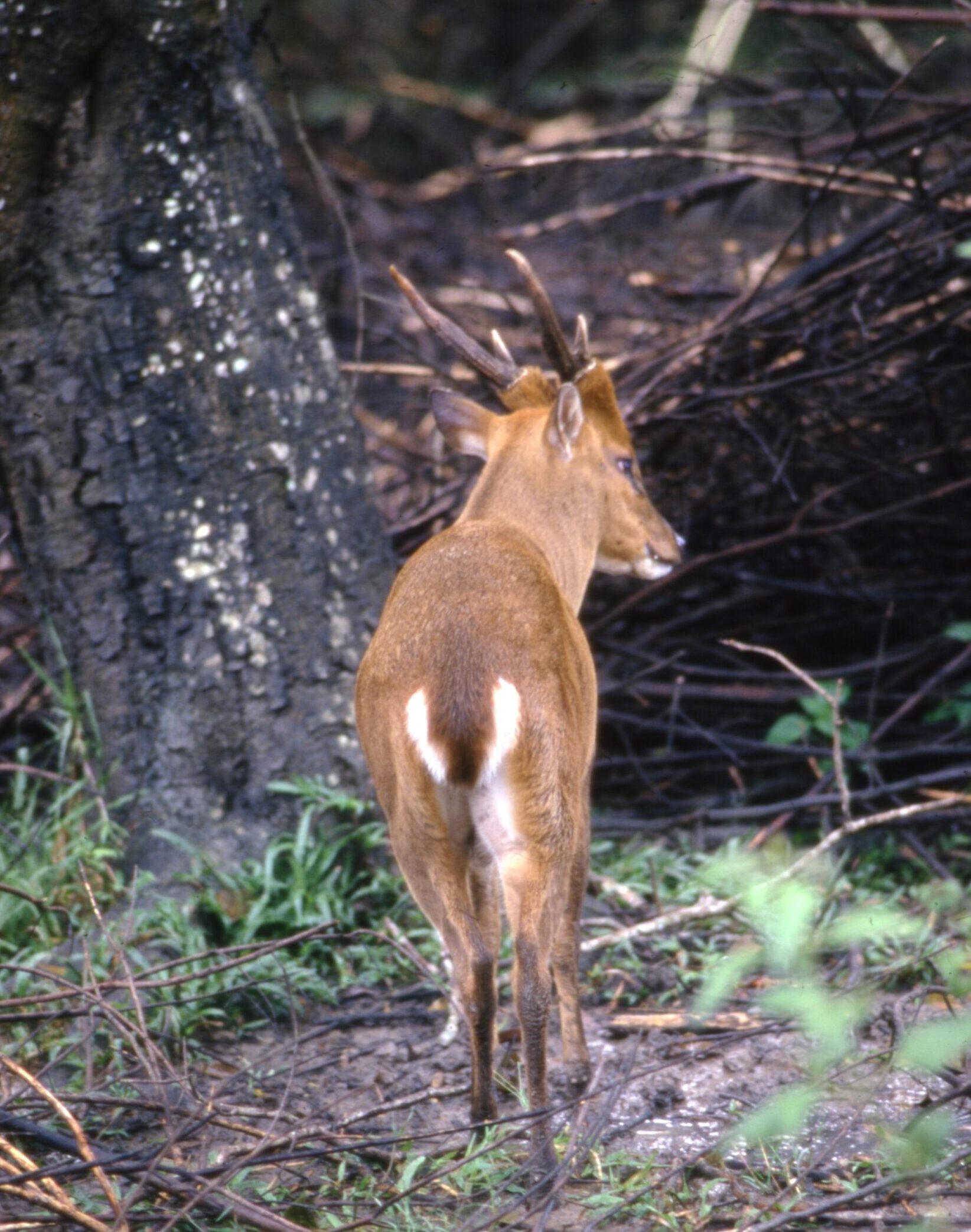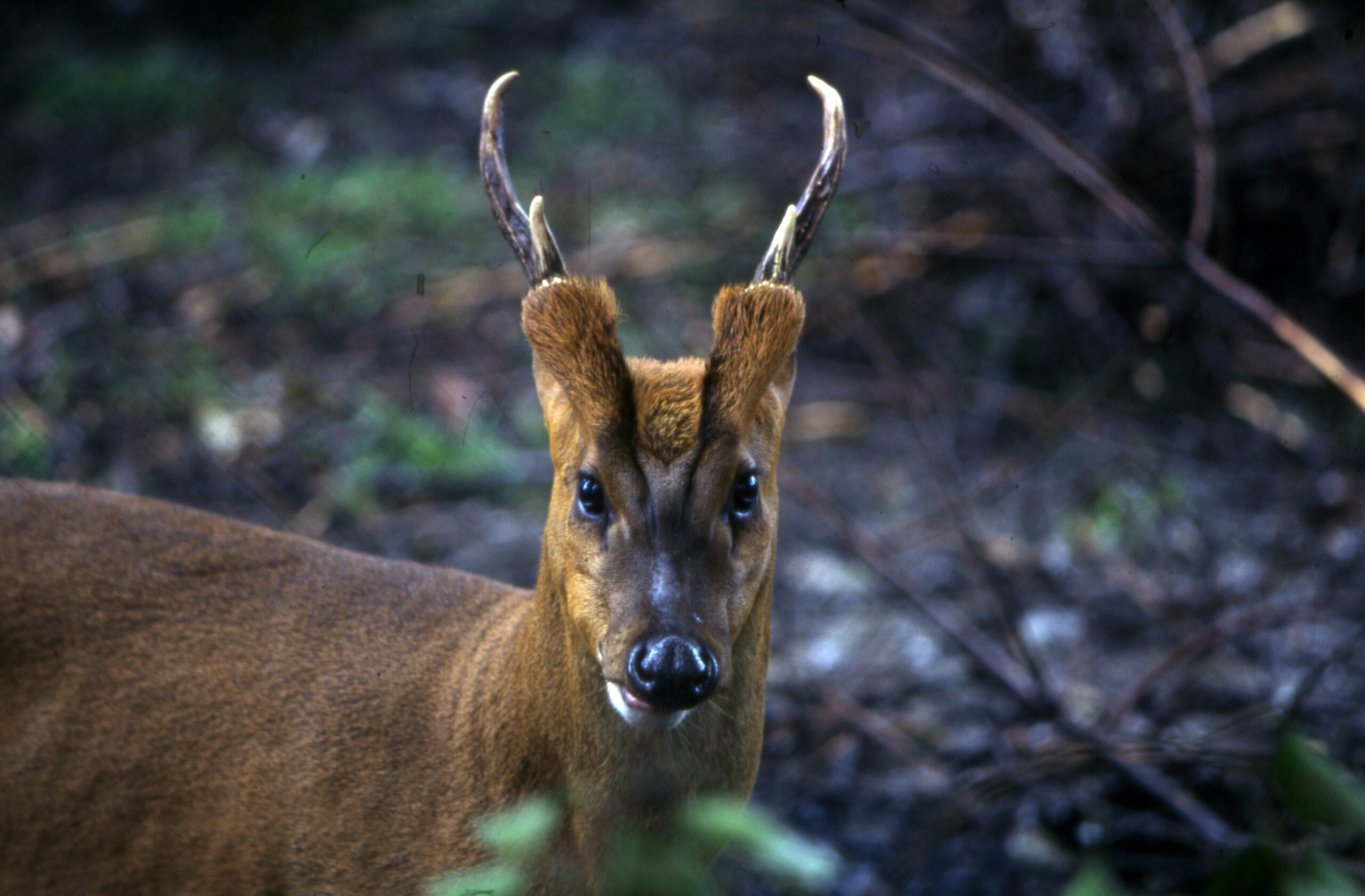 Jeg ved ikke meget om denne nye hjort. Ja, jeg ved faktisk kun at dens gevir er mere end dobbelt så langt som den almindelige muntjaks. Og at dens rosenstokke, (de to korte ben-udvækster på panden af handyrene hos alle hjorte plus hos rensdyrkøerne), kun er halvt så lange som hos den almindelige muntjak. Dens gevir er også buet eller svunget på en lidt anden måde. Det ligner faktisk ret meget geviret på en ung sambar hjort. Derfor er det så vigtigt for mig at fotografere dens gevir.