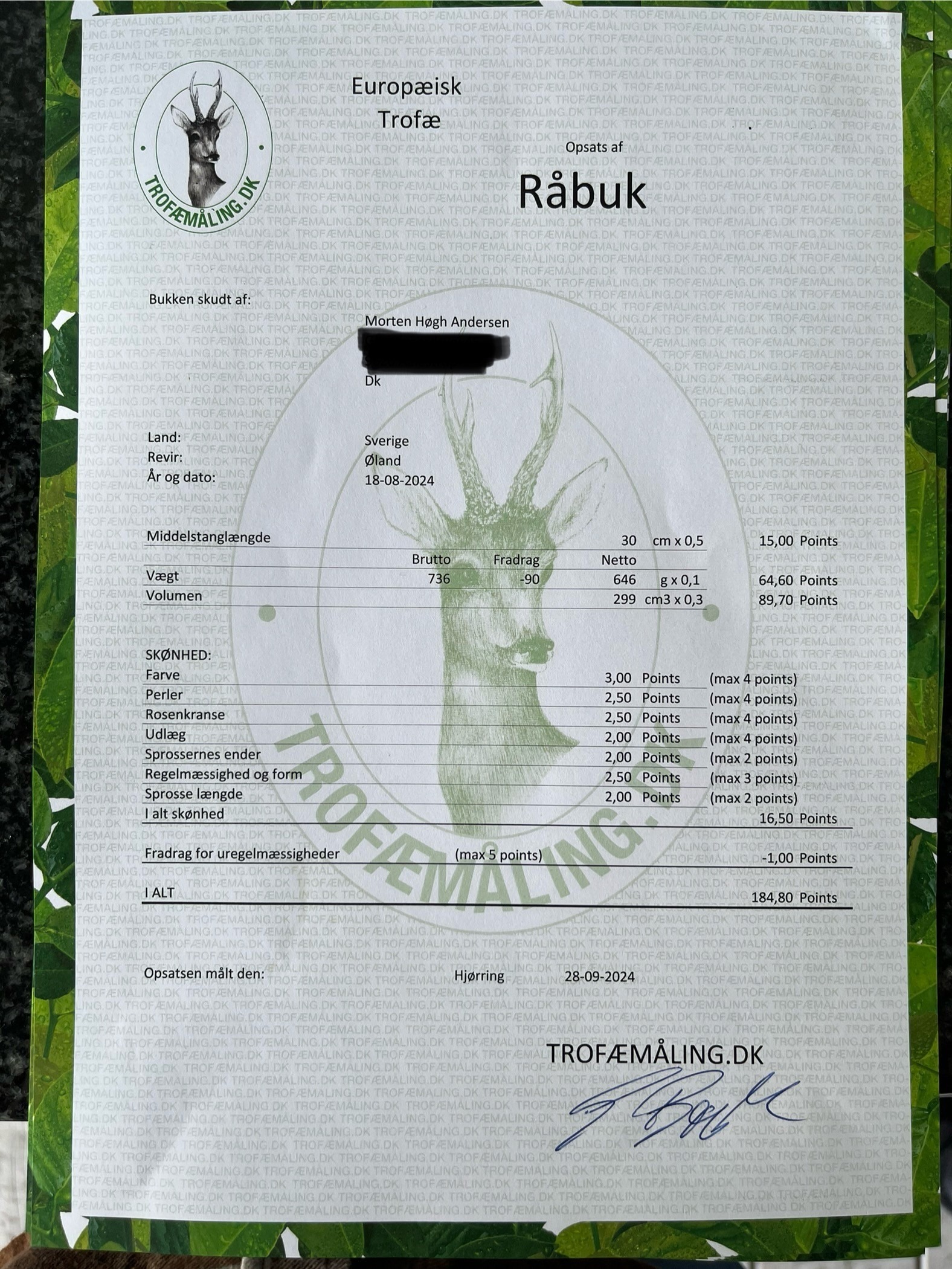 Morten Høgh Andersen har sendt informationer om en meget stærk buk nedlagt i Sverige i sæsonen 2024 …