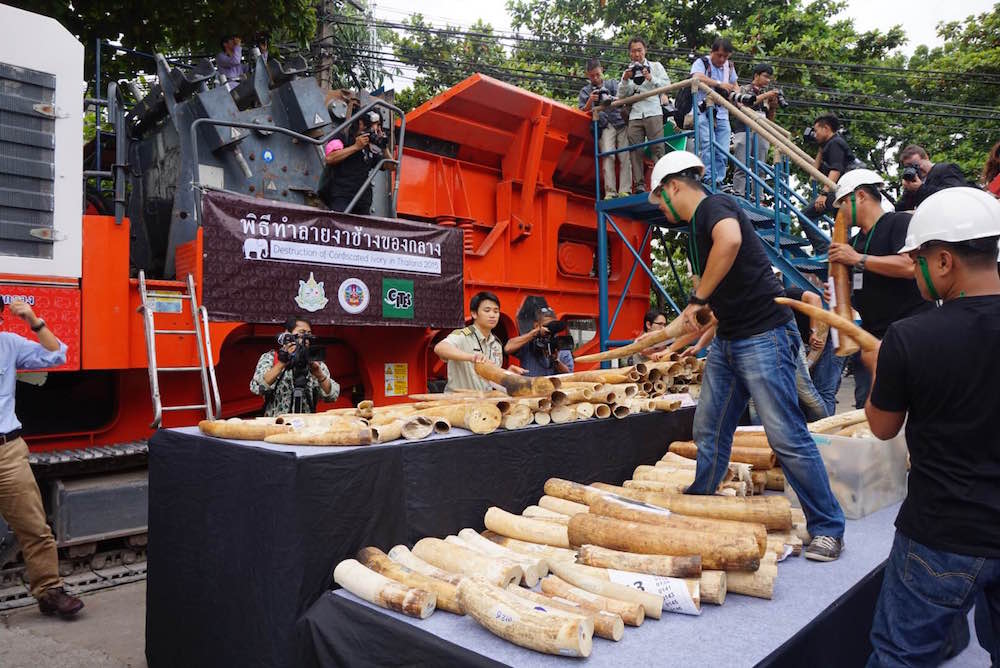 I et spektakulært show destruerede den thailandske regering forleden over to tons konfiskeret elfenben i en symbolsk handling, der skal vise, at landet er opsat på at standse den ulovlige handel med stødtænder fra elefanter.
