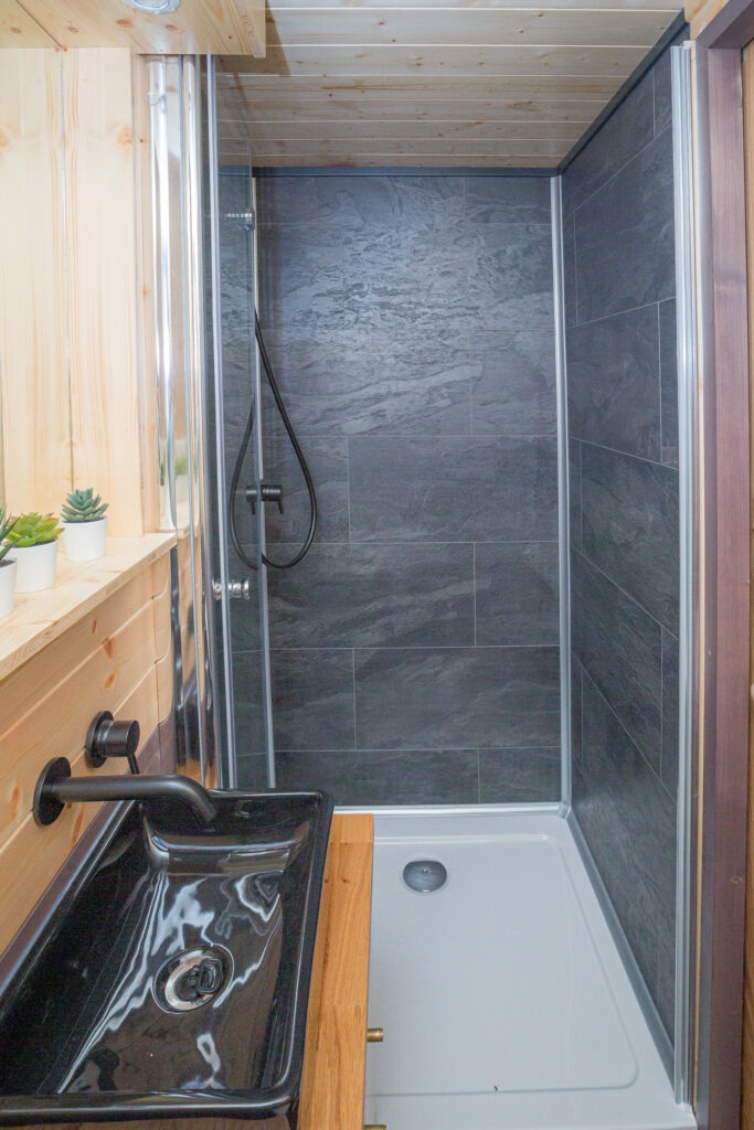 Ulrik Rasmussen: – Hubertusmodellen leveres med stor brusekabine, men om man ønsker en regnbruser – eller et mere økologisk og vandbesparende brusehoved er naturligvis op til en selv. Vand efter bad kan lukkes ud via afløb. Dette gør placeringen mere fleksibel, da affald efter toiletbesøg afbrændes automatisk og kan efterlades i naturen som lugtfri aske.