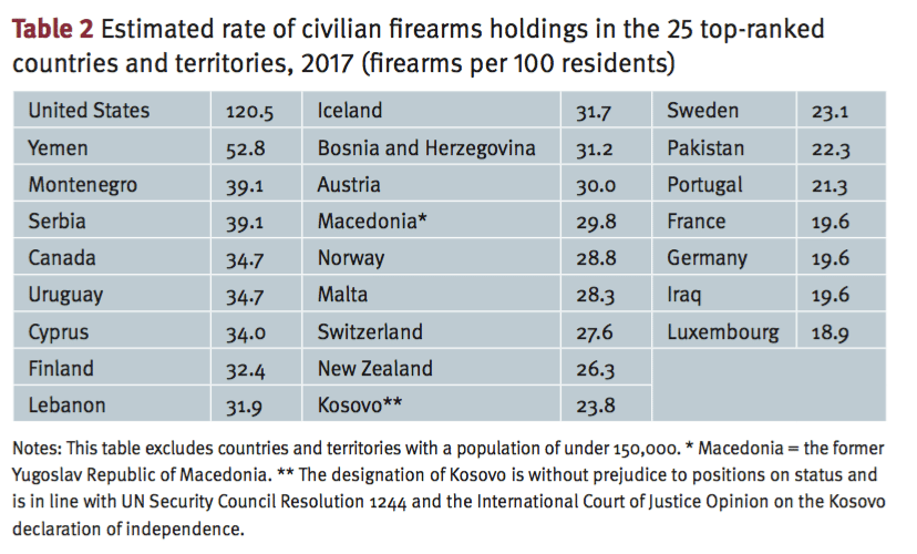 I følge oversigten, som der kan ses et uddrag af herunder, betyder det, at amerikanere ejere 46 pct. af verdens samlede beholdning af private skydevåben.