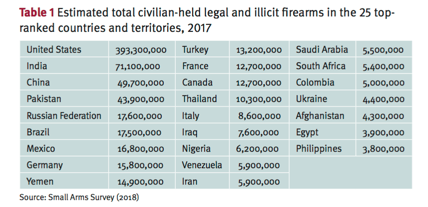 Small Arms Survey har udarbejdet en oversigt over hvor mange private skydevåben, der findes i 230 lande fordelt over det meste af verden.