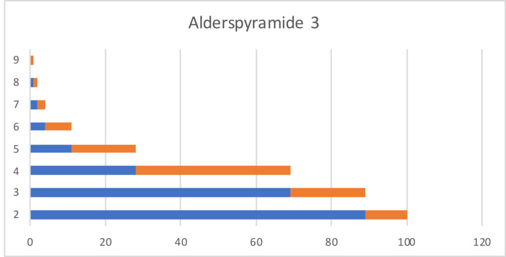 Det betyder, at i Alderspyramide 1 har vi til de nederste tre lag i (2-4 år) brugt 212 klodser af 300, og derfor har 88 tilbage. Hvis vi anvender dem med samme procentdel i de næste lag (33 %) ender vi med 25 klodser fra lag 7 og opefter (8 +). Den sidste klods finder vi i lag 12 (13 år).