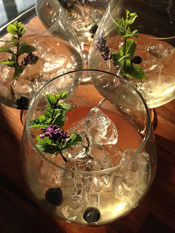 Tilsæt en stilk mynte og to tørrede enebær, og pynt med en frisk lavendelblomst øverst.